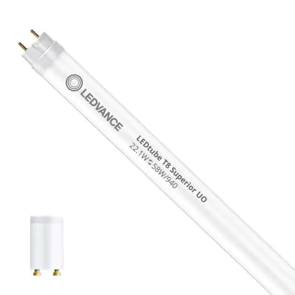Il Ledvance Tubo LED T8 Superior (EM/Mains) Ultra Output 22.1W 4100lm - 940 Bianco Freddo | 150cm - Best Color Rendering - Sostitutiva 58W è l’alternativa perfetta per il tubo fluorescente standard 58W nelle plafoniere con un reattore. Con questo tubo LED hai una garanzia di una vita media utile molto lunga e 5 anni Lampadadiretta.it di totale garanzia. .