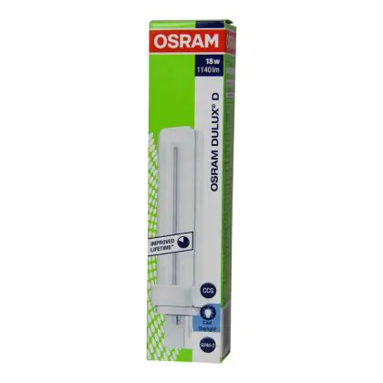Questa lampada fluorescente compatta Dulux D OSRAM presenta l’attacco a innesto G24d-1 con due spinotti. Grazie alla tecnologia a fluorescenza, è un’ottima soluzione per un’illuminazione affidabile con un consumo energetico di 18W. È adatta per un’installazione negli apparecchi luminosi dotati di alimentatore convenzionale.