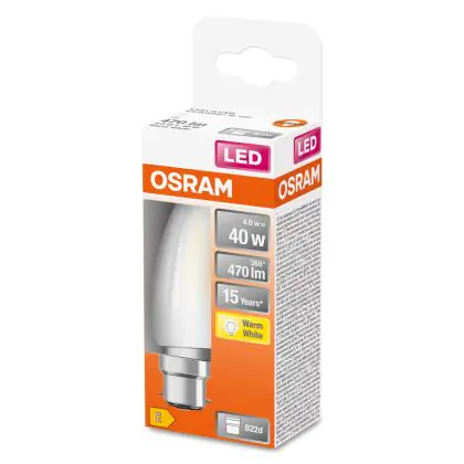 La Osram LED B22D Candela Filamento Ghiaccio 4W 470lm - 827 Bianco Molto Caldo | Sostitutiva 40W è la sostituzione perfetta per la tua lampada convenzionale 40W B22d. Sostituire con il LED ti offrirà molti vantaggi.